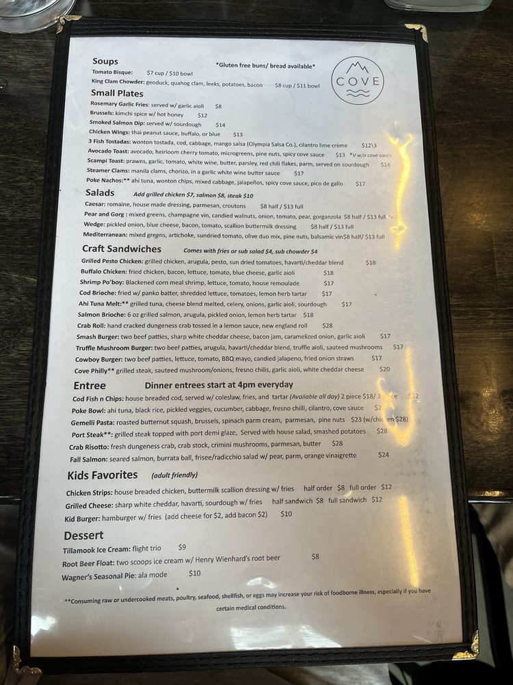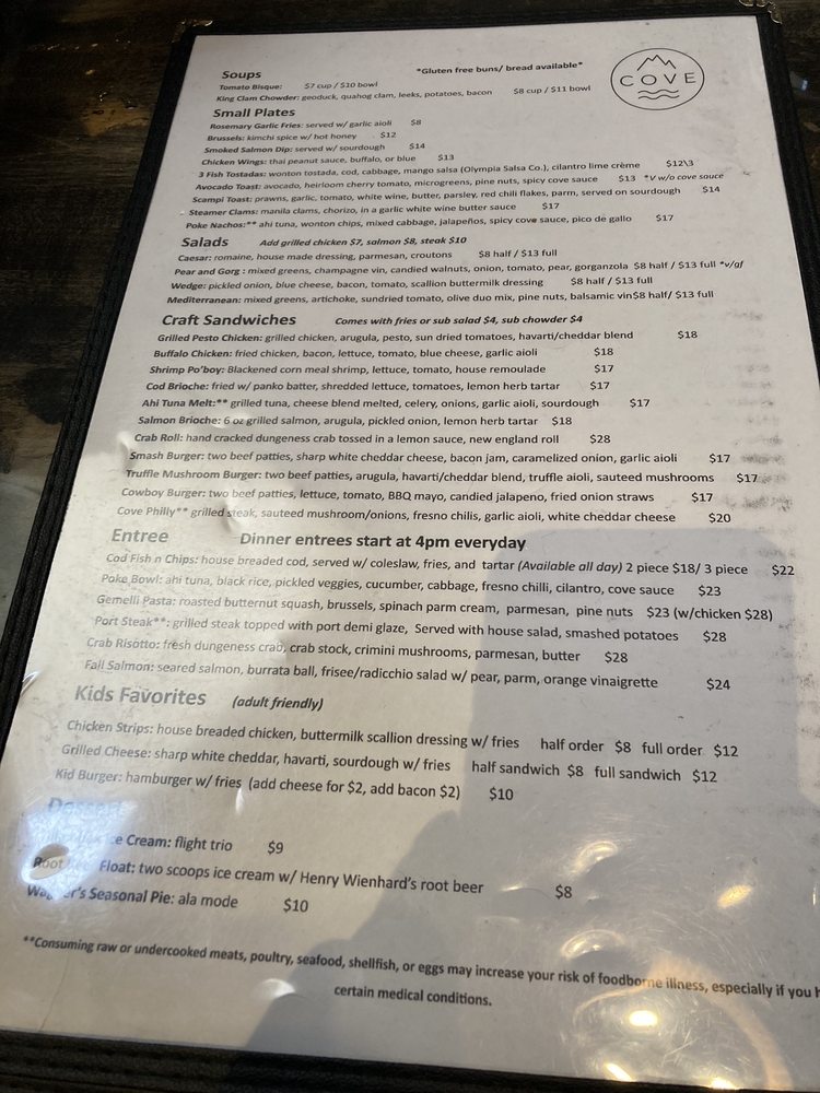 COVE, located in Olympia, WA, offers a trendy and upscale dining experience focusing on breakfast and brunch sandwiches. With a range of small plates like Avocado Toast and Steamer Clams, salads such as Caesar Salad, and soups like King Clam Chowder, the menu caters to a variety of tastes. The restaurant provides excellent service and a vibrant atmosphere, making it a popular choice for date nights and group gatherings. Customers rave about the Truffle Burger, Smash Burger, Thai Wings, and Poke Nachos. Happy hour specials and a full bar add to the overall appeal of COVE. With a commitment to sustainability through compostable containers and plastic-free packaging, COVE not only offers delicious food but also cares for the environment. Indulge in their flavorful dishes while enjoying the lively ambiance provided by live music nights and Sunday football deals.